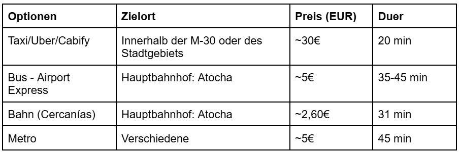 Wenn du mit dem Zug in der Stadt ankommst, empfehlen wir dir, zu prüfen, ob der Hauptbahnhof (Atocha) oder der Nebenbahnhof (Chamartín) deiner Unterkunft am nächsten liegt; beide Bahnhöfe liegen in der Stadt und sind gut mit öffentlichen Verkehrsmitteln erreichbar. Weitere Informationen findest du unter: Renfe