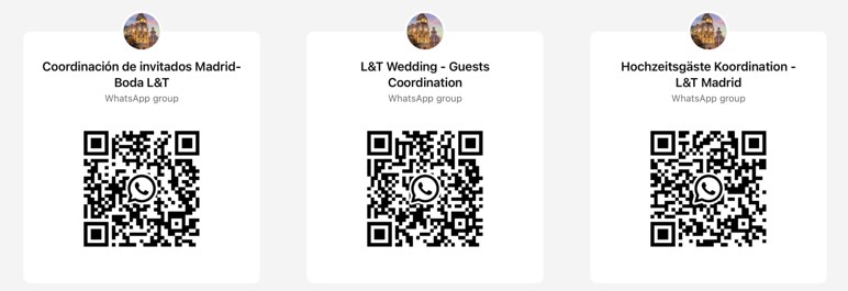 Animamos a todos a utilizar estos grupos para compartir consejos de viaje, sugerencias de actividades en Madrid o coordinar planes con otros durante la semana de la boda. Por favor, toma en cuenta que estos grupos son autogestionados, por lo que pedimos encarecidamente a todos los participantes que respeten la dinámica del grupo y mantengan las discusiones relevantes y relacionadas con la boda.
